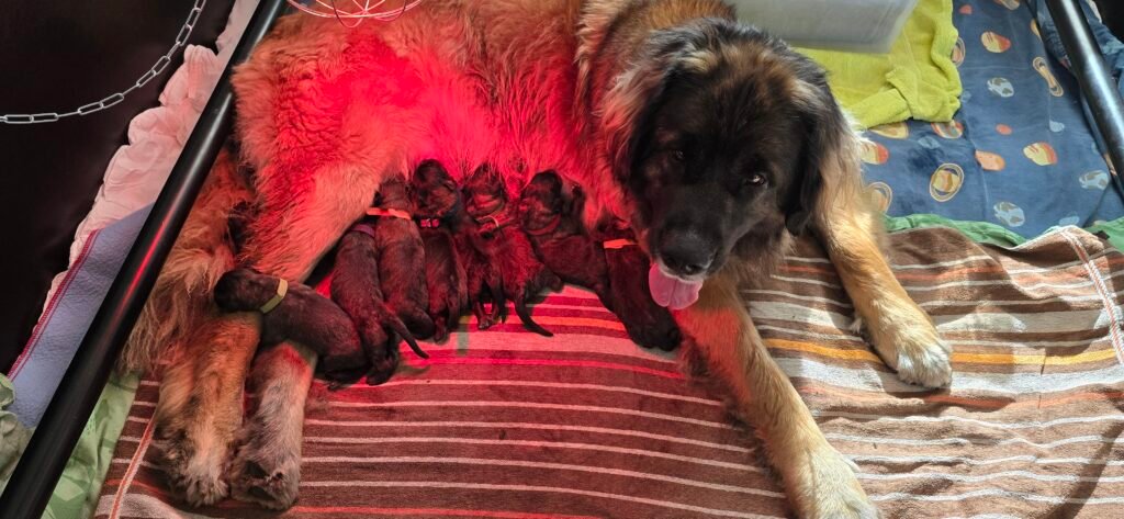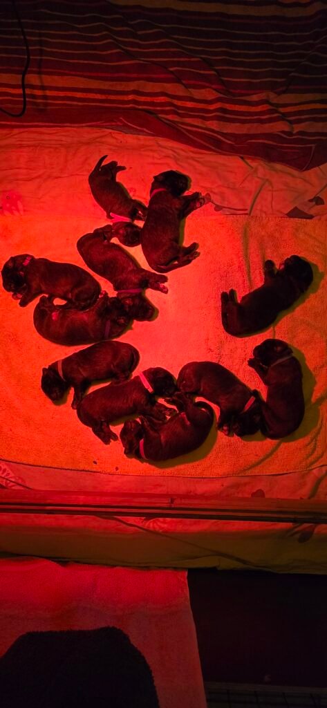 Bella is bevallen van 11 puppen, 6 teefjes en 5 reutjes. Dat is een heel groot nest met de bijbehorende logistieke problemen, aangezien een teef maar acht voedingspunten heeft.